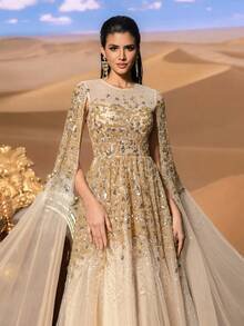 SD3236 One-Shoulder Cape Sleeve Sequin Gown