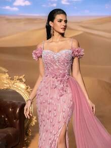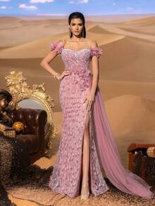 SD3220 Off-Shoulder Pearl & Beaded Slit Gown