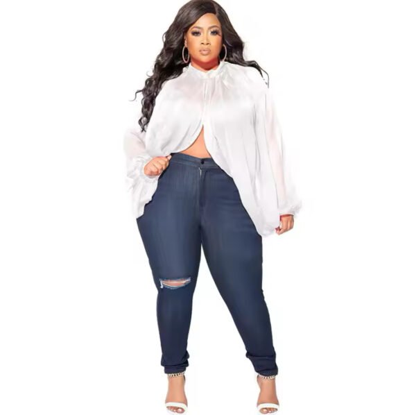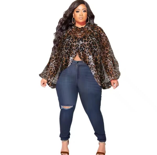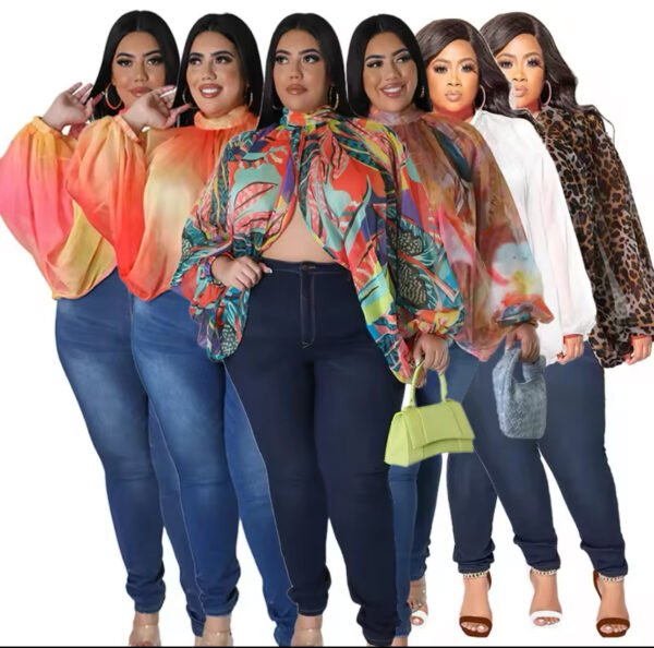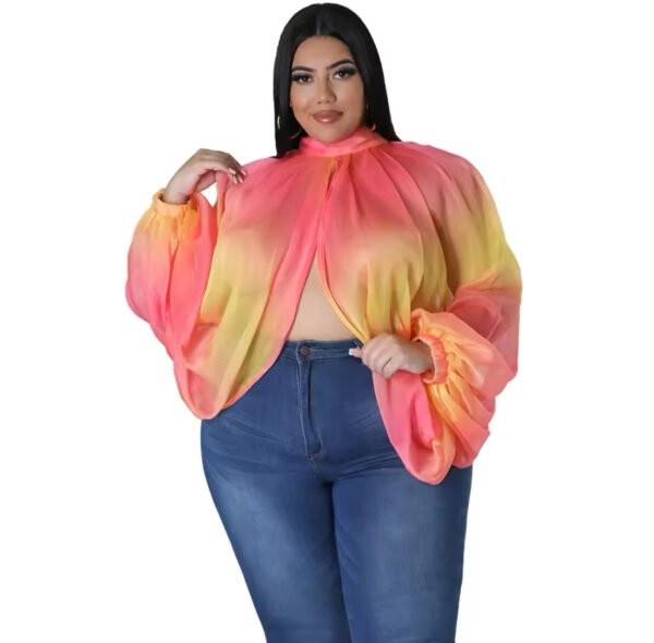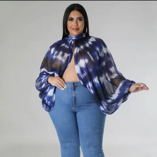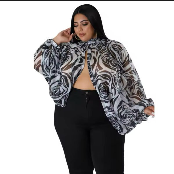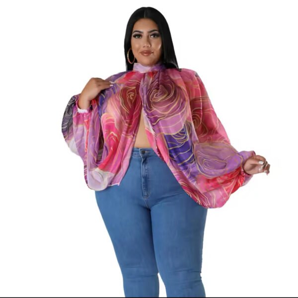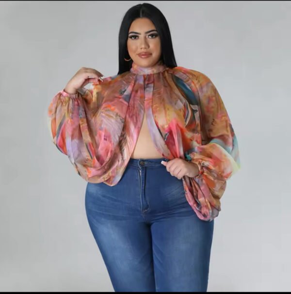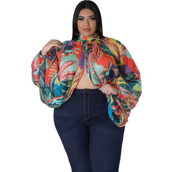 Long-sleeved, floral print plus size chiffon blouse with a high neckline. The blouse has a loose, flowing fit and features large, abstract floral designs, with slit and backless lace up ideal for party or clubbing.