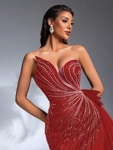 SD3180 Red Asymmetric Bustier Sequin Gown