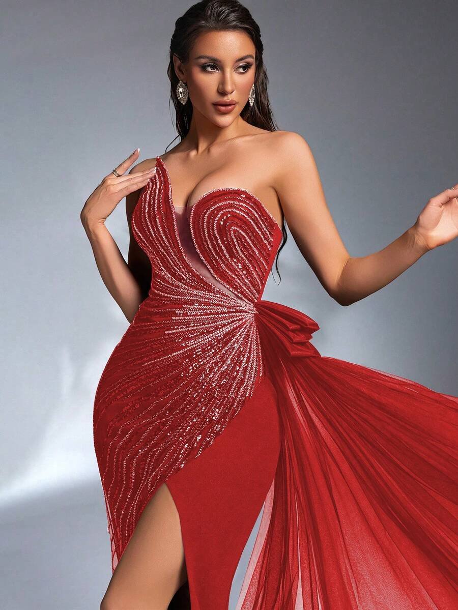 Intricate Textures & Flow Crafted from premium knit fabric, this gown is detailed with exquisite sequin embroidery patchwork for a luxurious shimmer. The design is elevated by a 3D mesh pleated side that flows elegantly to the floor, creating a dynamic sense of movement. A daring thigh-high slit adds a confident, high-fashion finish to the floor-length silhouette.