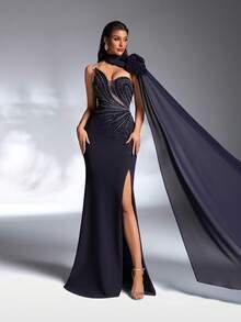 Versatile Couture & Modern Grace Step into sophistication with the SD3188 Luxury Navy Blue Gown. This dress features a unique asymmetric neckline in a sleek strapless design, offering a sharp, high-fashion silhouette. The deep navy blue hue provides a timeless, regal alternative to classic black, ensuring you stand out with understated elegance.