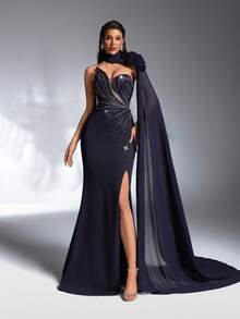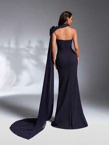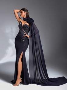 Customizable Floral Artistry The highlight of this gown is the stunning detachable floral applique, allowing you to customize your look from a bold, avant-garde statement to a clean, minimalist aesthetic. Paired with a daring high slit, this dress balances romantic textural details with a confident, modern edge that moves beautifully with you.