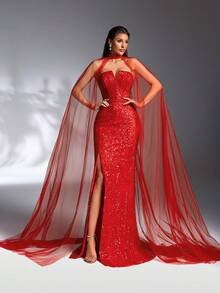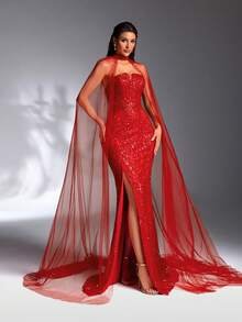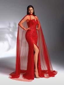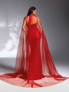 SD3201 Red V-Neck Sequin Gown & Sheer Shawl