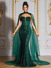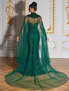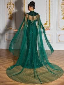 Heavy-Duty Detailing & Versatile Styling This “heavy-duty” gown is meticulously crafted with sequin and beaded fabric, providing a dense, shimmering texture that reflects light beautifully. A unique feature of this design is the detachable sheer collar shawl, allowing you to transition from a modest, regal look to a more open, contemporary aesthetic in seconds. The intricate beadwork and embroidery ensure a premium, boutique-quality feel.
