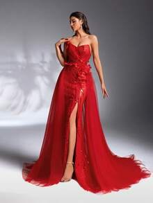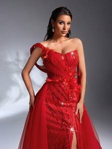 SD3205 Red 3D Floral Sequin Trailing Gown