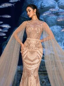 Opulent Artisan Beadwork True to its “Luxurious” status, this gown is meticulously hand-embellished with heavy-duty beadwork that contours the body. The intricate patterns follow the classic mermaid silhouette, highlighting your curves before flowing into a sweeping floor-length hem. The play between the structured, heavily beaded bodice and the airy, transparent cape sleeves offers a high-fashion contrast seen only on the most prestigious runways.