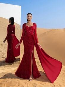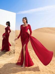 Romantic Architecture & Modern Drapery Step into the spotlight with the SD3227 Haute Glamour Evening Gown, a design that harmonizes classic romance with contemporary flair. Featuring a timeless sweetheart neckline that beautifully frames the bust, this gown is elevated by delicate sheer sleeves for an ethereal touch. The standout draped side detail creates a cascading, fluid effect that adds movement and a touch of Grecian-inspired elegance to your silhouette.