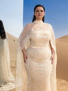SD3232 Plus Size Mock Neck Beaded Cape-Sleeve Gown