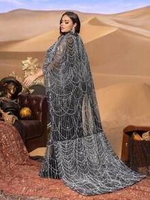 Artisan Embroidery & “Heavy-Duty” Beadwork True to our commitment to high-luxury craftsmanship, this gown is adorned with intricate hand-applied embroidery and beadwork. The embellishments are densely patterned across the bodice and the dramatic cape, creating a multidimensional texture that reflects light with a soft, sophisticated glow. This “heavy-duty” construction ensures the gown maintains its statuesque form while providing the premium feel of true couture.