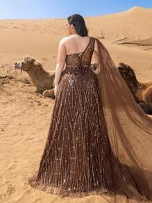 SD3236 One-Shoulder Cape Sleeve Sequin Gown