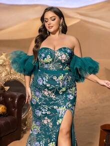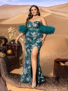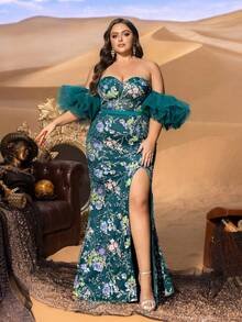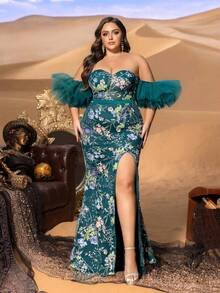 Romantic Architecture & Sculptural Drama Step into a world of high-fashion enchantment with the SD3279 Haute Glamour Plus Gown. This masterpiece features a classic, romantic heart-shaped neckline that beautifully frames the décolletage, leading into a precision-tailored mermaid silhouette. The standout feature is the voluminous mesh ruffle sleeves, which provide a soft, ethereal cloud of movement around the arms, perfectly balancing the daring allure of the thigh-high slit.